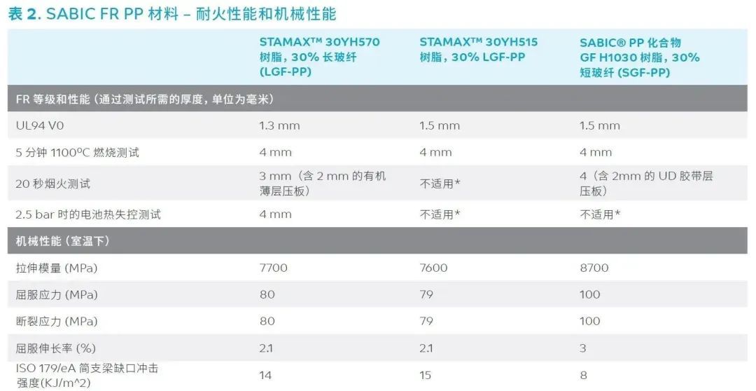 下图表 2 概述 SABIC 关键的 FR PP 材料以及 FR 等级、燃烧时间以及热失控测试性能和机械性能。
