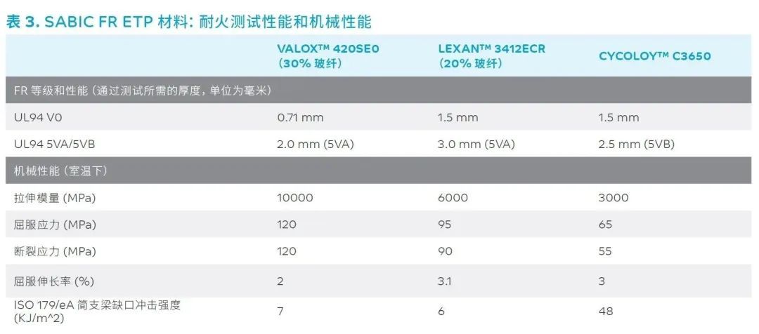 表 3 列出了几种 FR ETP 材料及其 FR 等级、防火测试性能以及机械性能。根据我们的测试和分析,我们针对通过相关测试给出了材料厚度建议。