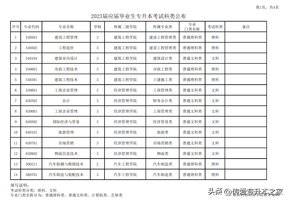 2023年重庆专升本已有4所院校公布考试科类表!