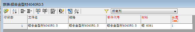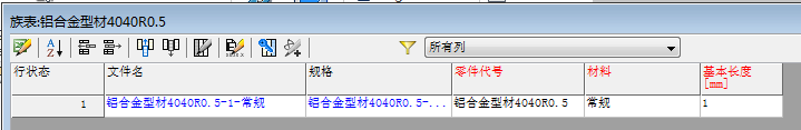 打开之前发布的铝型材的族表,默认族表如下图。这里主要是对“基本长度”一列修改。族表修改前后的比较如下图。