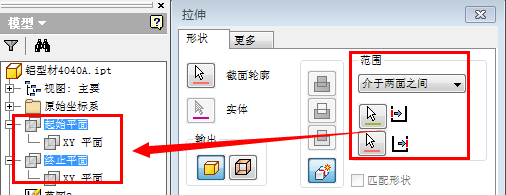拉伸特征的延伸类型:延伸类型应当为“从表面到表面”,选择“起始平面”作为开始创建特征的曲面,选择“终止平面”作为终止创建特征的曲面。