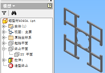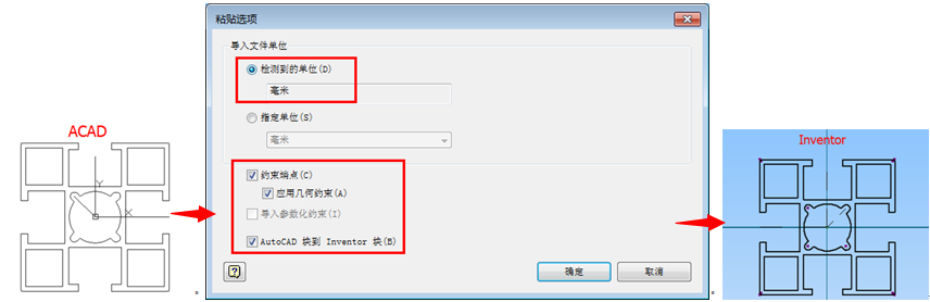 第三步,在XY平面上创建一个型材的截面轮廓,可以直接从AutoCAD中直接复制,在粘贴时要注意粘贴选项,一个是导入的单位,一个是约束,如下图所示。