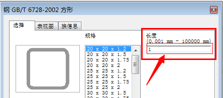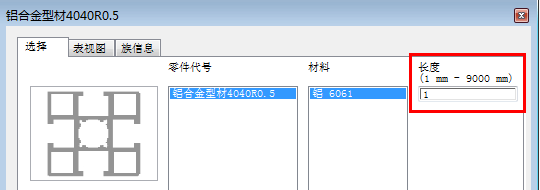 修改族表后,我们再次“从资源中心打开”该型材时,对话框中的长度已经可以自己输入,如下图,比如我们可以输入长度为100。