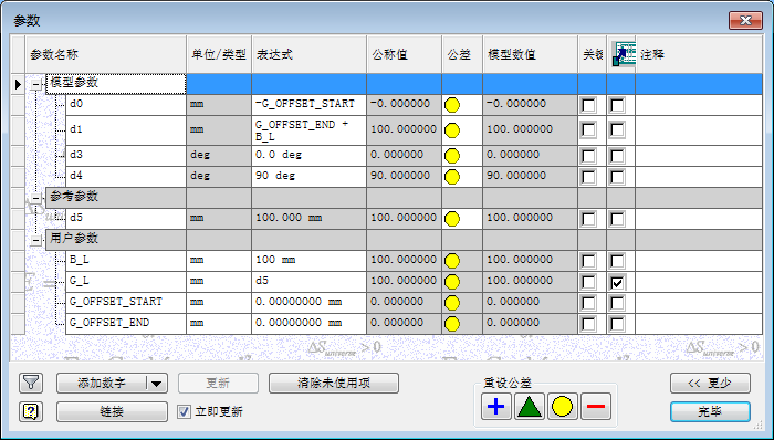 第一步,新建一个新的零件,在参数对话框中创建两个用户参数参数,其参数名称和表达式按下图输入。图中的参数“d0”为创建起始平面自动产生的。