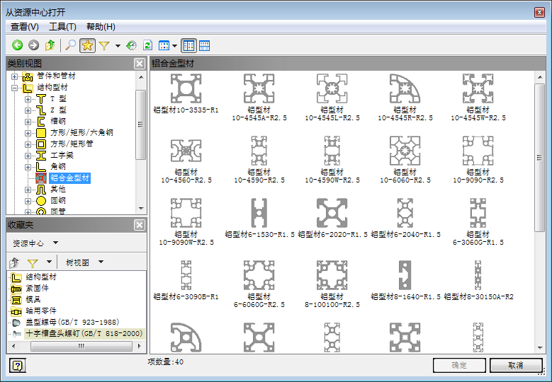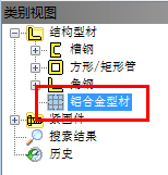 如下图所示,可以在资源中心库中的类别“结构型材”下创建一个“铝合金型材”类,如下图所示。当然也可以再创建一个塑钢型材,如果需要。这些都是需要用户花一些时间去整理创建,然后作为共享资源,分享给整个设计团队,以提高整体设计效率。