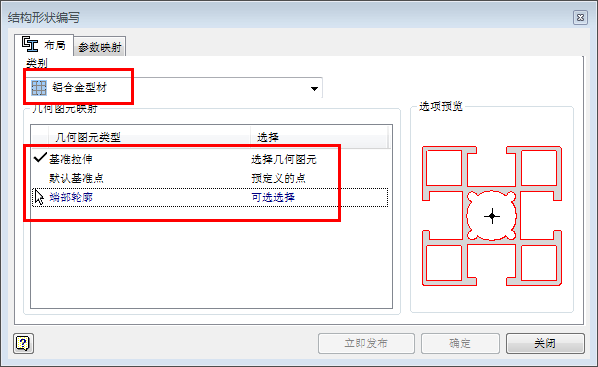 第六步,在【管理】-【编写】面板中找到“结构形状”,对零件执行编写命令。类别选择前面创建的“铝合金型材”,可在视图窗口中选择相应的几何图元映射,在“参数映射”选项卡上,选择“B_L”作为“基本长度”。单击“立即发布”。