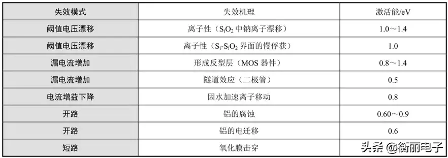 激活能 E 与器件的失效模式及失效机理有关。有关半导体器件不同失效模式与机理的激活能数据如表2所列。