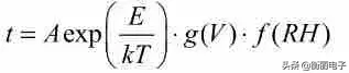 加速寿命试验中,也有用湿度作为加速变量,也有同时采用温度、湿度和电应力进行加速的。如 THB(高温、高湿和偏置)加速试验,其主要目的是评价器件的耐潮湿寿命,采用的公式如下: