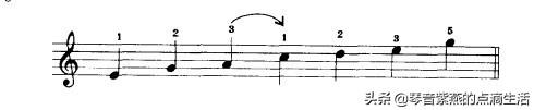 3.跨指法,当高音向低音方向进行时,将2、3、4(5指一般不用)其中的一个手指从拇指上方跨越,以保持旋律的连贯和流畅。谱例如下。