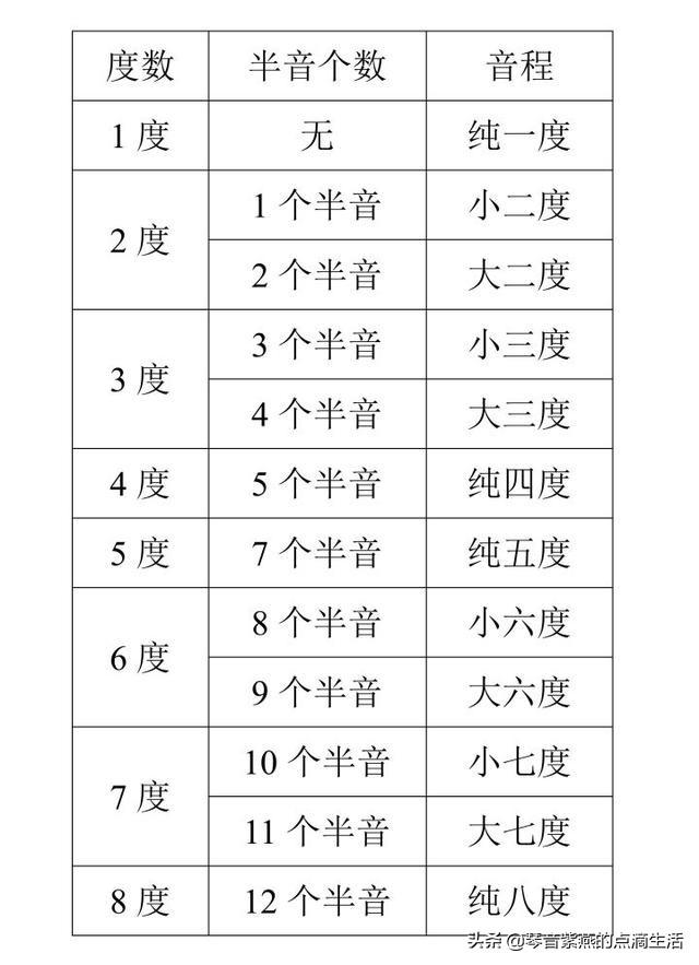 距离0个半音:完全一度 距离1个半音:小二度(MI / FA)、增一度(DO / #DO) 距离2个半音:大二度(DO / RE)、减三度(#RE / FA) 距离3个半音:小三度、增二度 距离4个半音:大三度、减四度 距离5个半音:完全四度 距离6个半音:增四度、减五度 距离7个半音:完全五度 距离8个半音:小六度 距离9个半音:大六度 距离10个半音:小七度 距离11个半音:大七度 距离12个半音:完全八度