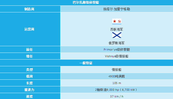 而“巴尔扎姆”级是俄海军主要的侦察船之一。“巴尔扎姆”级船长105米,宽15.5米,满载排水量4500吨,最大航速20节,续航力为7000海里/16节,是俄海军最适合跟踪监视美国海军航母编队活动的侦察船。舰桥上部装有2个高达5米的球形罩,估计内有用于卫星通信的收发天线。3个桅杆上装有各种监听、测向无线电侦察设备。“巴尔扎姆”级船在舰桥上部的右舷还有夜间及恶劣气候条件下专用的望远镜。
