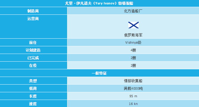 尤里·伊万诺夫级电子侦察船是一种新型的俄罗斯的情报收集舰。该船由JSC中央设计局Iceberg设计。该船的排水量超过4000吨,巡航距离不少于13000公里,其武器装备包括轻型防空武器。该船在性能和功能上大大优于前几代同类船,这主要是由于其多功能性和高水平的自动化与系统集成。第一艘船尤里·伊凡诺夫(Yuriy Ivanov)于2013年9月30日下水。第二艘船伊凡·库尔斯(Ivan Khurs)于2017年5月16日下水。