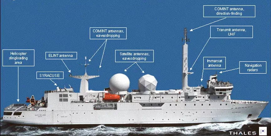 法军“迪皮伊·德·洛美”号情报侦察船,搭载功能全面的情报处理设备以及卫星通信设备,船员编制110人中78人是情报分析人员,用于进行现场实时情报处理,能够为海上编队直接提供情报支援,侦察船所有搜集及分析后的数据利用“斯库拉斯Ⅱ”(SyracuseⅡ)型通信卫星发回法国国内,并能够为海上编队直接提供情报支援,综合侦察能力较之前服役的“布干维尔”高约数十倍。