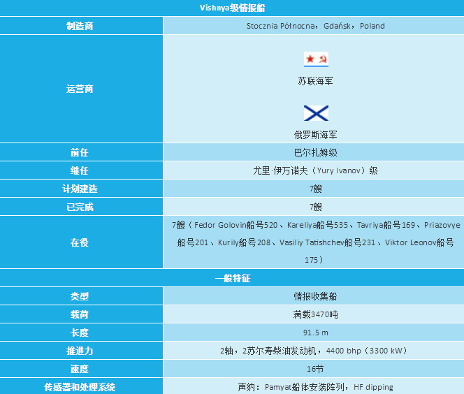 Vishnya级情报船是大型专用船,旨在通过各种传感器收集信号情报。数据可以通过安装在两个大型天线罩中的卫星链路天线传输到海岸。这些舰队装备有两个AK-630近距离武器系统和SA-N-8地空导弹(SAM)发射器,用于最后的自卫。