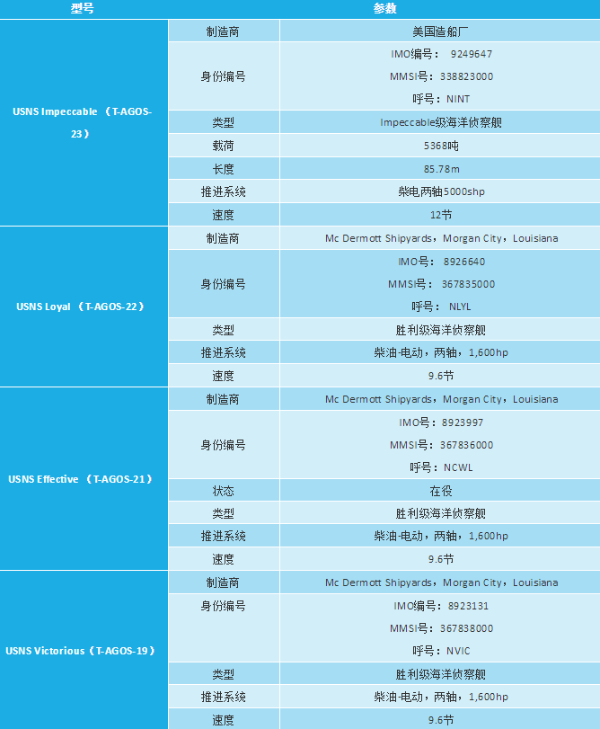 美国现役海洋监视船(T-AGOS)主要有: