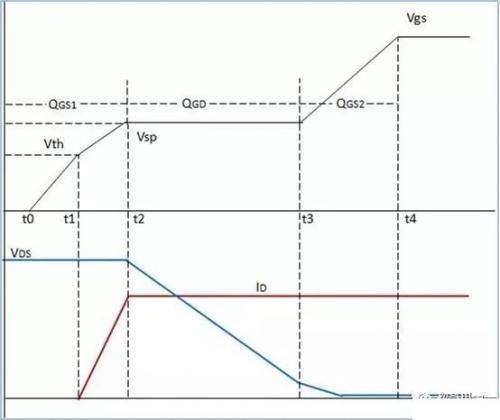 VGS(th)和 VGP 在功率 MOSFET 的数据表中可以查到,有些数据表中没有标出 VGP,可以通过计算得到平台的电压值。 产生开通损耗的时间段为 t1-t2 和 t2-t3,t0-t1 时间段不产生开通损耗但是会产生延时。