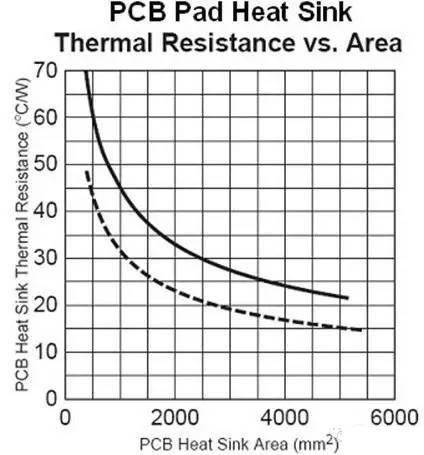 负载开关的稳态功耗并不大,但是瞬态的功耗很大,特别是长时间工作在线性区会产生热失效问题。因此 PCB 的设计,特别是贴片的 MOSFET,要注意充分敷设铜皮进行散热。在 MOSFET 的数据表中,热阻的测量是元件装在 1 平方英 2OZ 铜皮的电路板上。Drain 的铜皮铺在整个 1 平方英寸 2OZ 铜皮的电路板。实际应用中,Drain 的铜皮不可能用 1 平方英 2OZ 铜皮的电路板,只有尽可能的用大的铜皮来保证热性能。具体的降额值可能值可以参见以下的图。 如果是多面板,最好 D 和 S 极对应铜皮位置的每个层都敷设铜皮,用多个过孔连接,孔的尺寸约为 0.3mm。