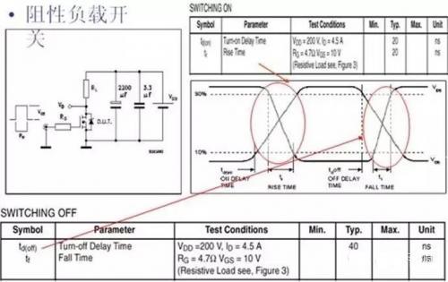上升和下降的延时和 Crss、Ciss 都相关,测量条件是阻性负载。如果是感性负载,电感电流不能突变,那么由于电感的续流,这个时间就和负载的特性相关。