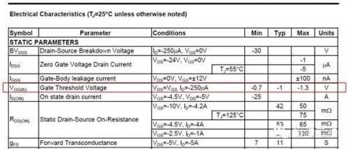 3、在 AO3401 规格书的第 1 页有写 operation with gate votages as low as2.5V,是否是要求 G 极电压必须大于 2.5V? VGS 必须小于 -2.5V?设计 VGS=-1.6V 有没有问题?如果继续加大 VGS 到 -1V 呢?是不是 VGS 的大小没有关系,只要保证 RDS(on)产生的功耗不要导致 MOSFET 过热就行,是否正确?