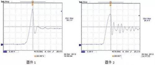 问题 14:想请教一个有关 MOSFET 的关断时 DS 电压振荡的问题,在同一个电路上测试了两个不同厂商的 30V 的 MOSFET,得到了关断时不同的 DS 电压波形,如下图。可以看到器件 1 的尖峰较高,但是振荡抑制的很快;器件 2 的尖峰较低,但是振荡抑制的较慢。因为是在同一块 PCB 上测量的,所以电路的寄生电感,电阻等参数是不变的,现在只有器件不同。这种尖峰是电路上的寄生电感和 MOSFET 的电容谐振引起,但是不明白具体是这两个器件哪个参数的差别,会使得这种振荡表现这么不同。是否能够从器件数据的某些参数对比来选择一款实际应用峰值较低,振荡又能快速消除的 MOSFET 呢?