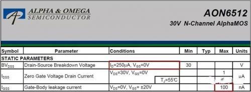 不同的公司 ST、Fairchild、IR、Vishay 等,可能使用不同的 Igss,如 IR1010 使用 200nA,IR3205 使用 100nA,目前行业内使用 100nA 更通用。BVDSS 的测试条件:ID=250uA, VGS=0V,有些公司使用 350uA、500uA 甚至 1mA,如果 ID 越大,BVDSS 电压值越高。