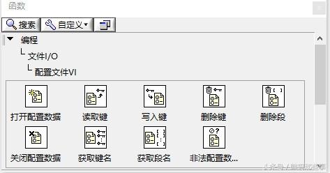LabVIEW中提供了一组用于操作配置文件的函数集,位于函数选板“编程”®“文件I/O”®“配置文件VI”子选板中,如下图所示,可以完成对配置文件的打开及关闭操作、键和段的读写及删除操作等功能。ini文件本质上是文本文件,因此,这些函数的实现过程也可理解为是LabVIEW内部对文本文件操作函数进行二次封装的过程。在LabVIEW中对配置文件的编程方式同普通文本文件类似,也遵循着打开、读写及关闭的三步原则。