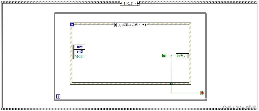 该例子主要演示ini文件的读写方法,所以主程序几乎没作任何功能,仅仅是让程序保持在运行状态,同时,当点击前面板的关闭按钮时能够退出程序,在事件结构的“前面板关闭?”事件分支中实现了这个功能,代码如下: