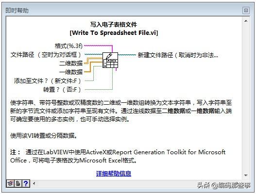 在使用LabVIEW软件编写大型测试程序时,很多时候需要将原始采样数据或者分析处理后的数据在硬盘上存储为文件,而存储的格式可以是直观的普通的文本文件,也可以是占用空间小的二进制文件,除了这些外,LabVIEW中还提供了一种更为简洁的文件格式的支持,即电子表格文件的支持,在LabVIEW中可以利用其提供的现成函数,方便的对数据进行电子表格文件的存储与读取操作。