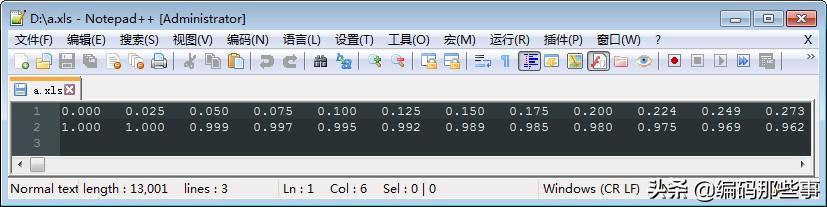运行上面程序,假定设置文件存储路径为“D:\a.xls”,则可以看到该文件中存储的两路正、余弦波形数据,如下图所示(仅显示了2行1000列的部分数据),共2行,分别代表了正弦波形数据和余弦波形数据,且每个值小数点后保留了3位小数。