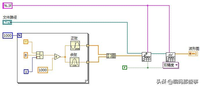为简单起见,在程序框图的For循环内部使用“正弦”、“余弦”函数分别产生包含1000个点的正、余弦波形的一维数组,在For循环外部将这两路一维数组信号组合成一个2行1000列的二维数组,使用“写入电子表格文件”将其存储到文件中,使用“读取电子表格文件”函数将其读出为二维数组,直接将其连接到波形图控件上进行显示即可。