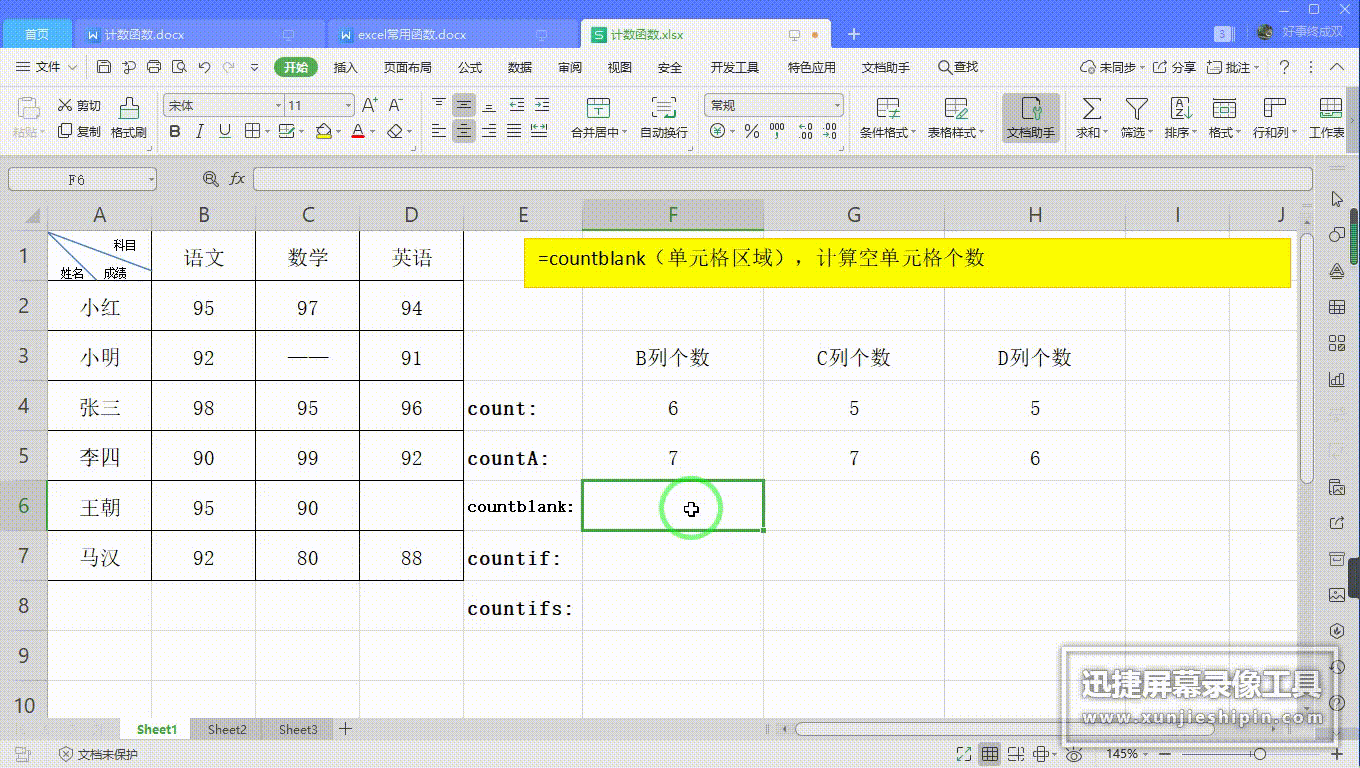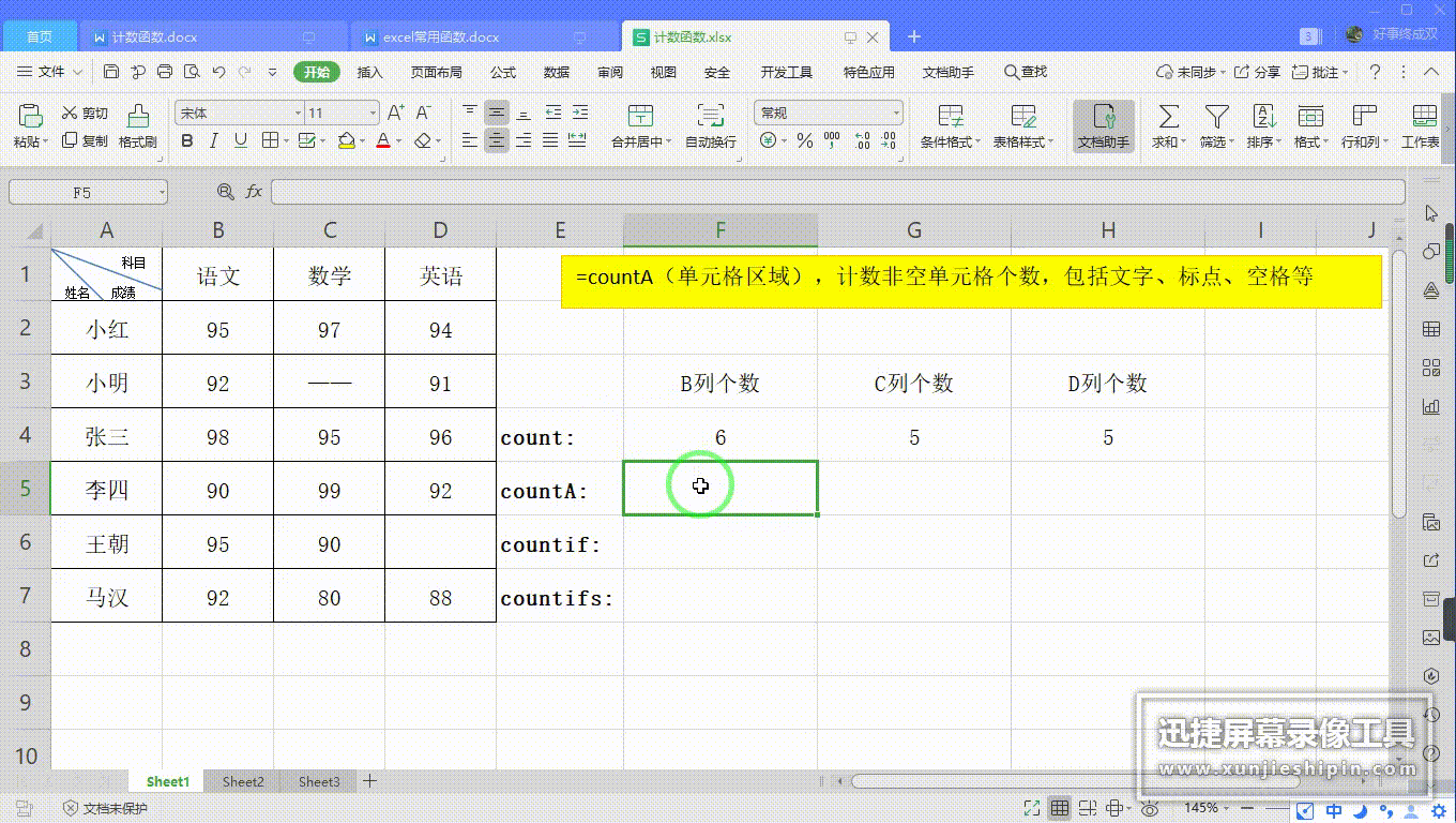 2.CountA函数: 统计区域中非空单元格个数,(注:文字、空格、标点符号等均为非空)