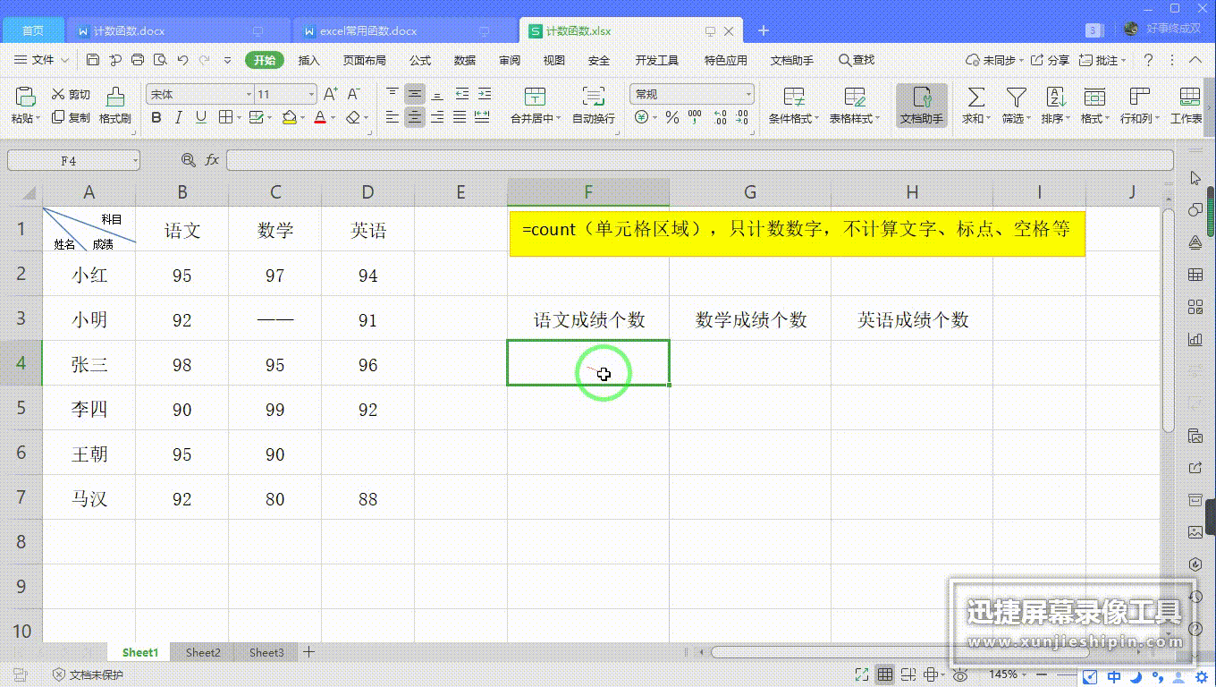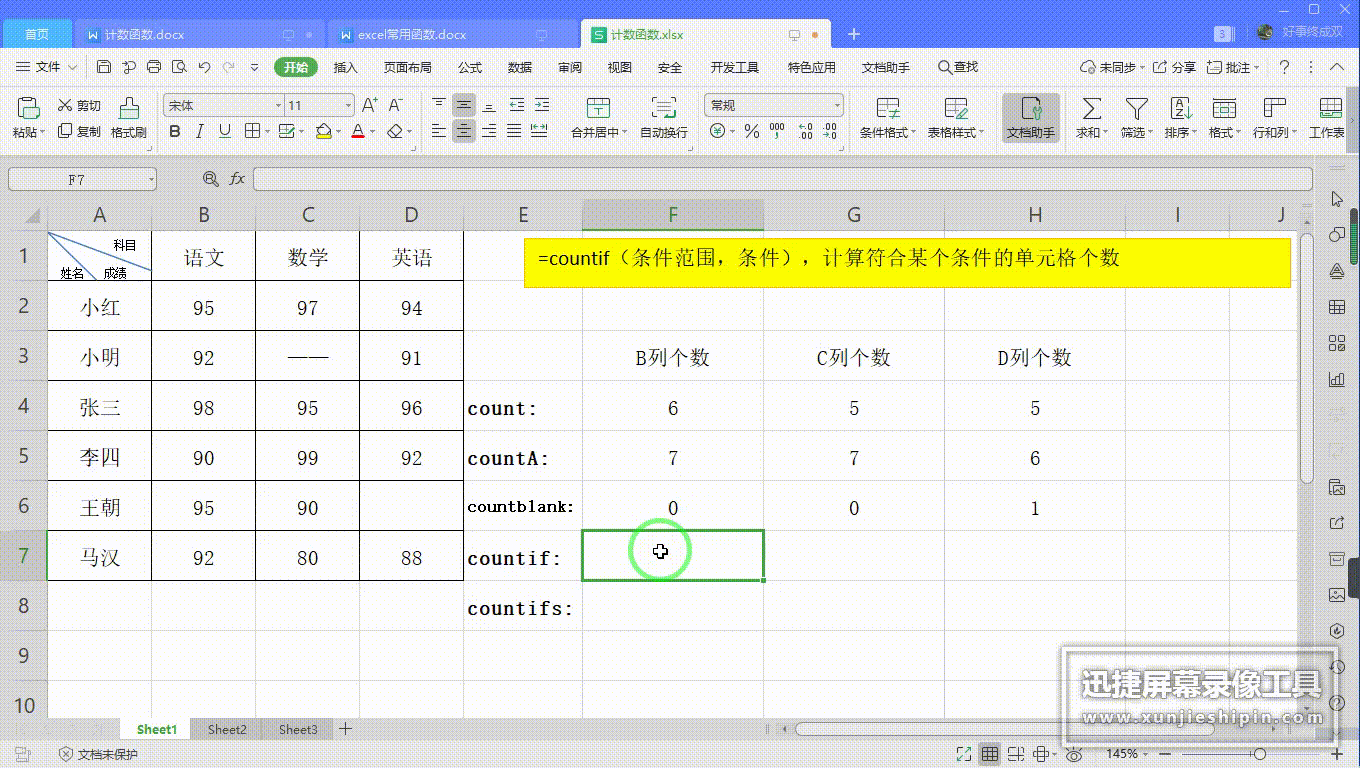 4.Countif函数: 统计符合某条件的单元格个数(单条件)