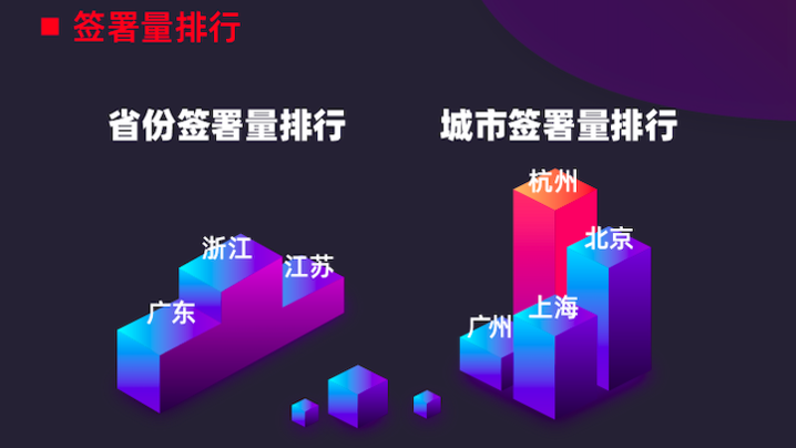 根据此次发布的《2018电子签名生态大数据报告》来看,电子签名行业的签署量排名中,前三个省份是浙江、广东、江苏,前五个城市是杭州、北京、上海、福州、重庆。