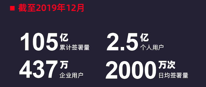 从推出中国首个电子签章“天印”系统,到推出中国首个电子签名SaaS平台,再到首次发布“智能合同”战略等,e签宝无论在行业经验,还是在资质技术、产品服务、客户体量等方面的沉淀,均领跑行业。截至2019年12月,e签宝已经服务超过437万家企业用户,个人用户突破2.5亿,累计签章量超105亿次,电子签名行业迎来百亿时代。