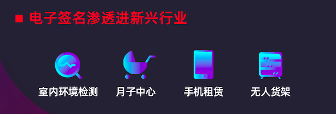 比如,装修后的室内环境是否合格,室内环境检测的需求使用到电子签名的越来越多;一方面是市场需求所致,另一方面也方便相关企业进行检测单据盖章的管理。月子中心也能使用电子签名了,随着月嫂、月子中心的普及,消费升级会对电子签名在这个领域更有需求;新型共享经济的崛起,让任何东西都有被租赁的可能,租手机的场景可以用电子签名来让租赁更加安全、值得信赖。