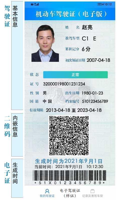 电子驾驶证由驾驶证基本信息、二维码内嵌信息、电子证生成时间3部分组成,与纸质驾驶证具有同等法律效力。其包含的基本信息主要包括驾驶人照片、证号、姓名、性别、国籍、出生日期、初次领证日期、准驾车型、有效期限、累积记分、状态、证芯编号一维码、住址、发证机关、档案编号、当前时间、记录(包括准驾车型起始日期、校车准驾信息)、准驾车型对照表等。