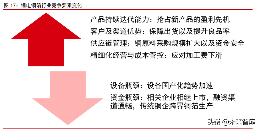 锂电铜箔行业的竞争要素发生变化:我们判断 2020-2021 年随着国内锂电铜箔行业的 快速发展,原先制约铜箔企业扩产的设备瓶颈、资金瓶颈等因素都不同程度地弱化,随着 企业产能扩张加速,现有的供应短缺格局预计迎来拐点,铜箔加工费及企业的单吨盈利能 力预计被压缩。未来锂电铜箔企业的竞争力将更多体现在:1)产品持续迭代带来的盈利 先机;2)客户及渠道优势;3)供应链管理能力;4)精细化经营与成本管控能力。