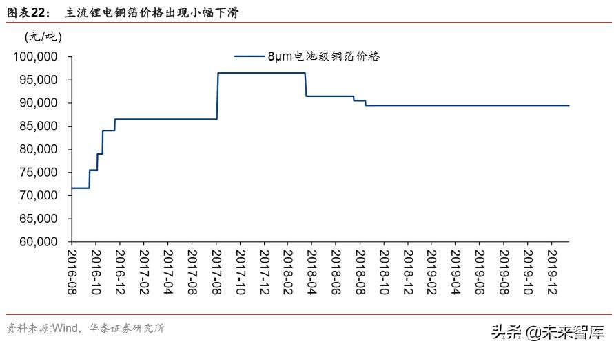 近两年由于产能快速扩张,铜箔市场由此前的供不应求到现在的紧平衡。CCFA 预计 19 年锂电铜箔供需缺口(产量-需求)为-0.5 万吨。截至 2020.2.11, 据我们统计 2020 年已 披露新增铜箔产能多集中在锂电铜箔,新增产能仍有近 4 万吨。据 CCFA 专家,目前国内 锂电铜箔行业已出现低端产能过剩,高端产能不足的现象。据 Wind,主流的 8µm 厚度的 锂电铜箔价格出现小幅下滑,8µm 以上的中低档铜箔价格更是出现较大幅下滑。我们认为 锂电铜箔行业已进入了由量转质的阶段,积极提升产品性能才是核心竞争力。