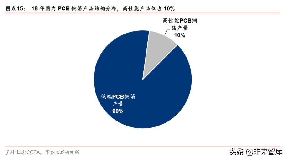上述 PCB行业分析可以看出,行业增速最高的方向是服务器/数据存储、及无线基础设施。 且国内多层板 18-23 年复合增速较高,势必对铜箔用量带来更大提升。据 CCFA,在目前 PCB 市场发展背景下,对于高档高性能铜箔如高频高速电路用铜箔、IC 封装载板极薄铜 箔、大功率及大电流电路用厚铜箔等需求增加明显。应用于常规领域 PCB 的铜箔需求则 不会有明显改善。