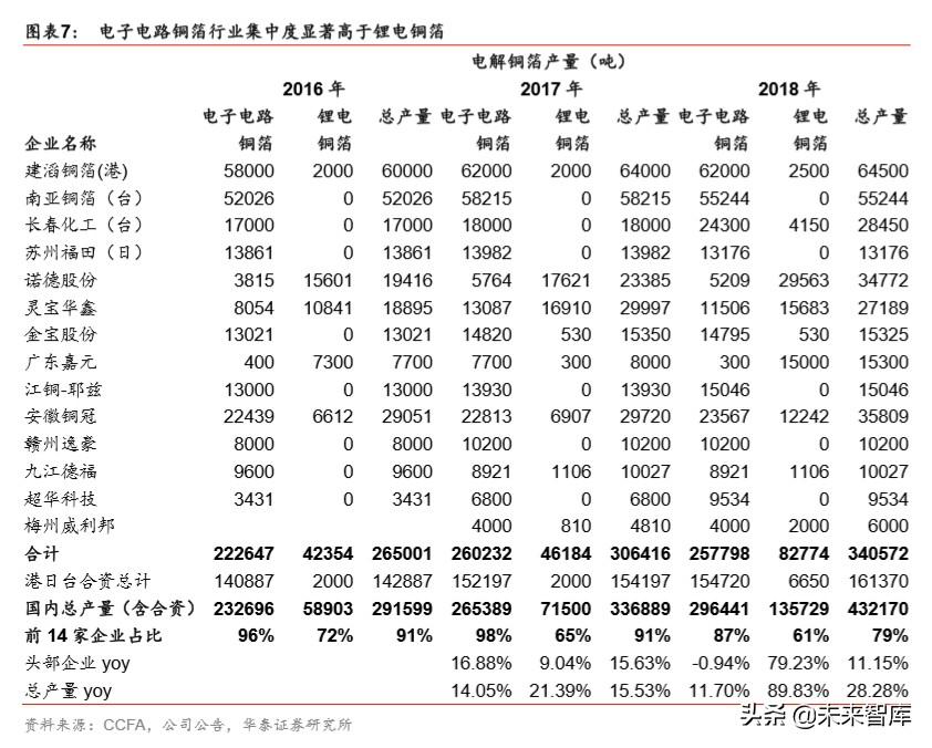 目前国内市场中电解铜箔产量占绝对优势。与电解铜箔相比,压延铜箔的生产企业较少, 产能主要集中在山东天和、灵宝金源朝辉铜业、中色奥博特苏州福田和众源新材五家。电 解铜箔的生产企业相对较多,但电解铜箔的产能依然集中于部分企业。据 CCFA,18 年前 14 家电解铜箔厂商总产量占国内总产量的 79%。港日台合资企业以生产电子电路铜箔为 主,内资铜箔厂商以生产锂电铜箔为主。