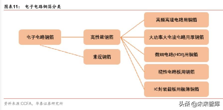 电子电路铜箔在印制电路板(PCB)中,起到导电、导热的重要作用,被誉为 PCB 上的神经 网络。当前把电子电路用铜箔(PCB 铜箔)分为两大类,即常规铜箔和高性能类铜箔。在 高性能类铜箔中,按照应用领域划分为五类:高频高速电路用铜箔;IC 封装载板用极薄铜 箔;微细电路(HDI)用铜箔;大功率大电流电路用厚铜箔;挠性电路板用铜箔(含电解铜 箔、压延铜箔)。