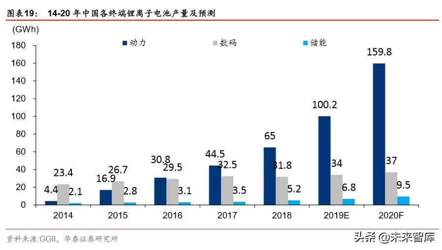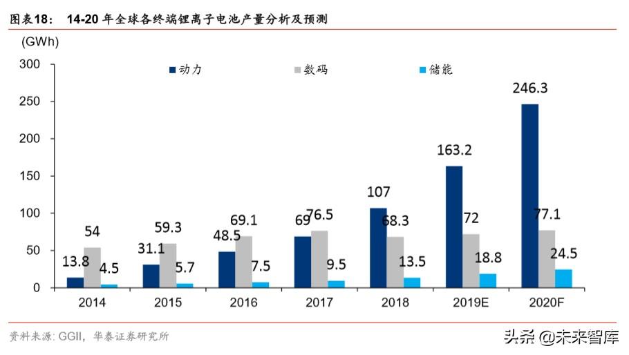 国内方面,据 GGII,2018 年中国锂离子电池市场产量同比增长 26.71%,达 102.00GWh, 中国在全球产量占比达 54.03%,GGII 预计 19 年产能有望达 141GWh,同比增长 38%。从中国锂离子电池的下游应用来看,2018 年动力电池受新能源汽车产业快速发展带动, 产量同比增长 46.07%,达 65GWh,成为占比最大的细分领域;2018 年 3C 数码电池 市场整体增长平稳,产量同比下降 2.15%,达 31.8GWh;储能电池领域虽然市场空间大, 但目前受成本、技术等因素限制,仍处于市场导入期,基数仍然较低,2018 年中国储能 锂离子电池产量增长 48.57%,达 5.2GWh。