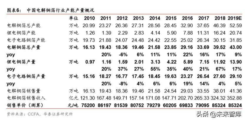 据 CCFA,2018 年我国国内电解铜箔的总产能达到 46.39 万吨,较 2017 年( 37.65 万吨) 增加了 8.74 万吨,yoy23.2%。2018 年成为 2010 年以来,中国电解铜箔的产能年增长率 最高的一年。产量方面,2018 年我国电解铜箔的产量为 39.52 万吨,比 2017 年(33.69 万吨)增加了 5.83 万吨,年增长率为 17.3%。锂电铜箔增速尤其显著,18 年产量达 11.92 万吨,增长约 67%。