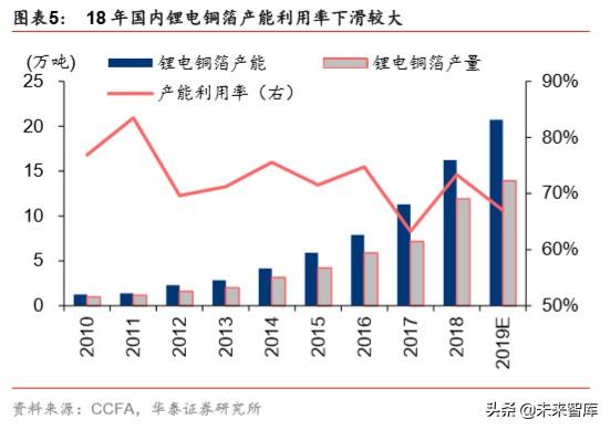 近几年,由于电子和新能源产业快速发展,全球铜箔产能增长迅速。据 CCFA,全球产能 从 2011 年的 59 万吨增长到 2018 年的 88 万吨,年复合增长率 5.85%;产量从 2011 年 的 35 万吨增长到 2018 年的 75 万吨,年复合增长率 11.48%,产能利用率呈上升趋势, 从 2011 年的 59%上升到 2018 年的 85%。