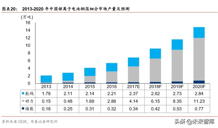全球锂离子电池产业快速发展,锂电铜箔作为锂离子电池的负极集流体,是锂离子电池行 业重要基础材料,锂电铜箔需求同样维持较高增速。从细分应用领域来看,动力电池市场 依旧是中国锂电铜箔市场保持高增长的主要驱动因素。据 GGII,预计 2019 年动力电池 用锂电铜箔产量同比增长 35.77%,达 8.35 万吨,超过数码电池领域需求量,在中国锂 电铜箔中的占比超过 50%。GGII 预计到 2020 年,中国动力电池产量将超过 158.8GWh, 动力电池用锂电铜箔产量将突破 11 万吨,成为中国锂电铜箔市场的主要增长点。