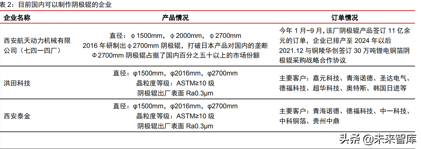 高性能阴极辊主要来源于日本进口,订单排期较长。目前全球 70%以上的阴极辊都由 日本新日铁公司、三船株式会社等企业提供,其价格非常昂贵,一台阴极辊售价高达 200 万元。同时由于设备定制和调试时间长,企业订购阴极辊往往需要排期 1 年以上,目前其 交付的订单已经排到 2024 年,没有新的产能以满足国内锂电铜箔的扩产需求。