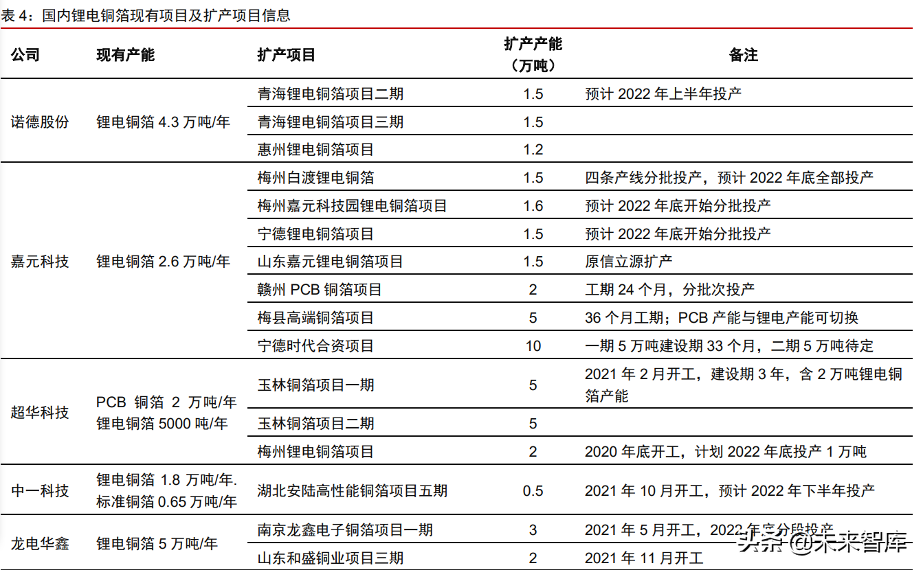2021 年国内铜箔企业产能扩张加速。在 2021 年新能源汽车产业迎来快速增长以及长 期需求向好的推动下,国内铜箔企业纷纷开启锂电铜箔的产能扩张计划。以行业中的上市 公司诺德股份和嘉元科技为例,两公司 2021 年现有产能分别为 4.3 万吨/年、2.6 万吨/年, 在建和规划产能分别达到 4.2 万吨和 13.1 万吨(若考虑嘉元科技和宁德时代的合资项目,嘉元科技总规划产能达到 23.1 万吨)。除了诺德和嘉元外,包括龙电华鑫、中一科技、德 福科技、华创新材等企业均有扩张计划。