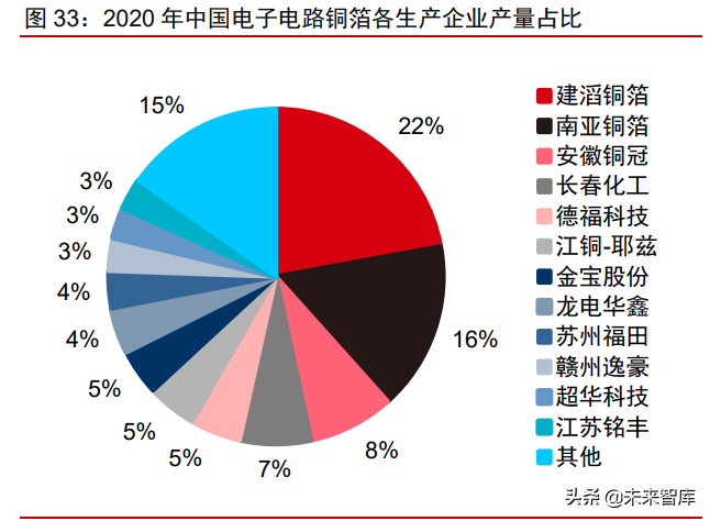 电子电路铜箔领域内资企业处于弱势。内资企业中产量占比最高的为安徽铜冠铜箔,2020 年产量占比约为 8%,与前两位企业差距较大。