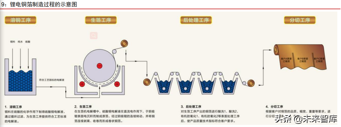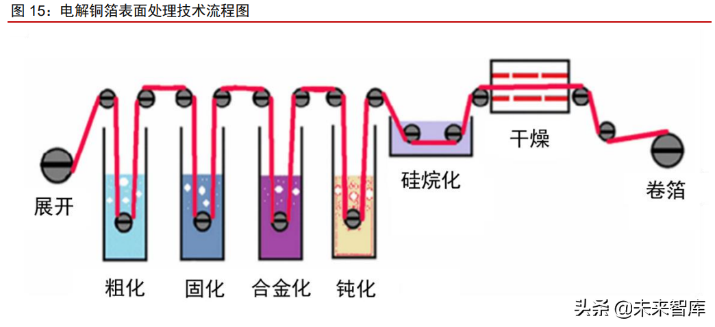 后处理工序对铜箔产品品质有显著影响。电解沉积产生的是表面性能较弱的生箔,仍 需表面处理技术来改善其性能。以电子电路铜箔为例,表面处理的工业流程一般包括粗化 -固化-合金化-钝化-硅烷化等工序。粗化可以增加铜箔表面的活性位点,固化可以进一步包 裹和加固得到的铜箔。合金化是在粗化、固化的基础上再镀一层或多层一种金属,以提高 铜箔的耐热性及抗剥离强度。另外,当电池中发生腐蚀时,耐热层会首先被腐蚀,而铜箔 则受到保护,进而起到防腐蚀性能。钝化处理可以有效提高铜箔运输过程中的耐磨性和抗 氧化性,延长铜箔的储存时间。与电子电路铜箔相比,锂电铜箔的后处理工序相对简单, 但如清理铜粉技术等同样是企业的核心技术壁垒。(报告来源:未来智库)