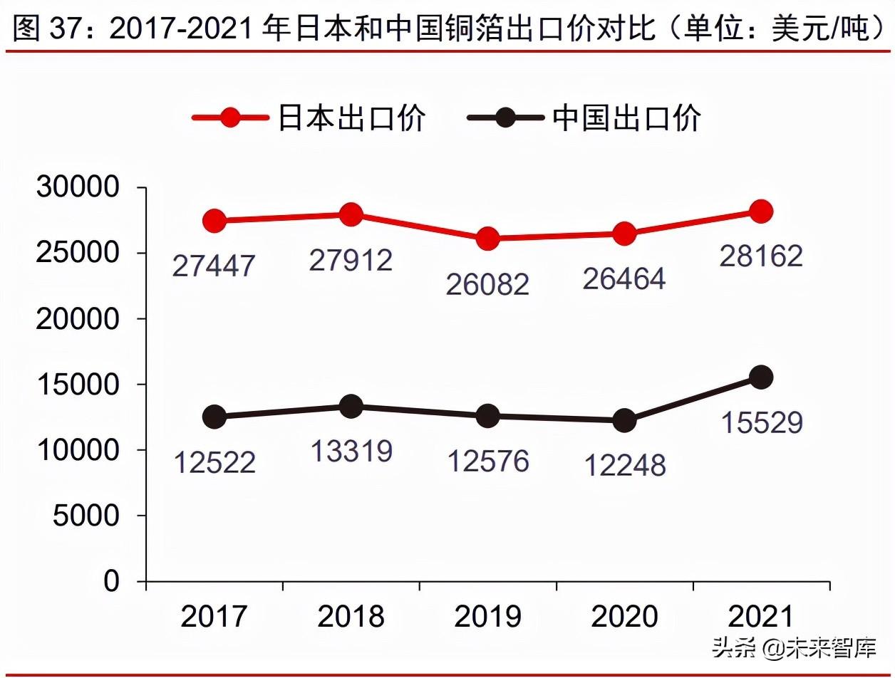 高端电子电路铜箔利润率远超传统铜箔,将成为内资企业的发力点。日本是传统的高 端铜箔出口国,2021 年 1-10 月,日本出口铜箔 16513 吨,平均出口金额高达 28162 美 元/吨,接近同期中国铜箔出口均价的两倍。高端电子电路铜箔的盈利能力远超普通铜箔, 率先实现技术突破并实现量产的企业有望抢占盈利先机,并持续提升利润率水平。(报告来源:未来智库)